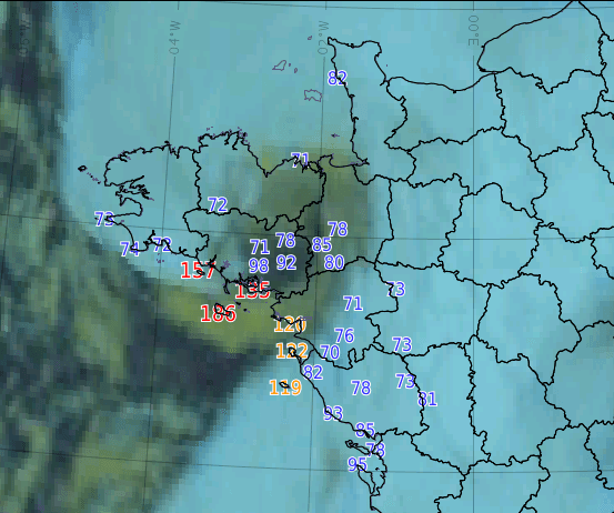 Notons également jusqu’à 157km/h à Groix, 135km/h à Sarzeau, 133km/h à Arzon, 131km/h à Vannes ou encore 116km/h à Rennes.  Bien heureusement, cette tempête fut moins violente qu’envisagé sur sa partie Ouest, notamment en Loire-Atlantique où les vents n’ont que très localement dépassé les 100km/h.
