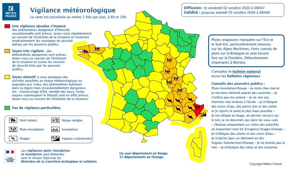A 06h00, Météo-France plaçait bon nombre de départements du Centre-Est du pays en alerte pour un risque de pluies/inondations. Les Alpes-Maritimes ont également été placées en vigilance rouge en raison des très importants cumuls de pluie attendus.