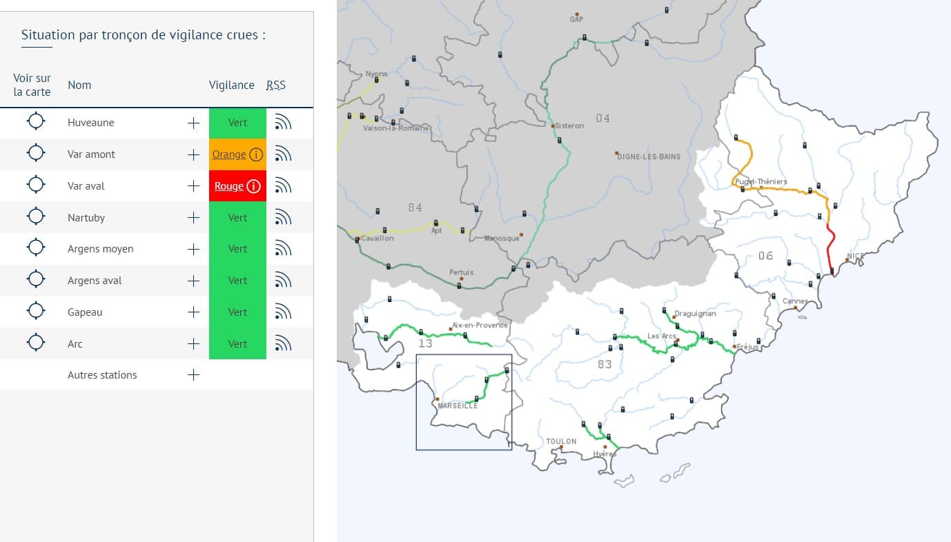 Les complications sont nombreuses en cette fin de journée sur les Alpes-Maritimes et l'Est Var. De très nombreux cours d'eau sont en crue, dont le Var. De nombreuses routes sont coupées à la circulation et certaines communes sont complètement isolées en cette fin de journée.
