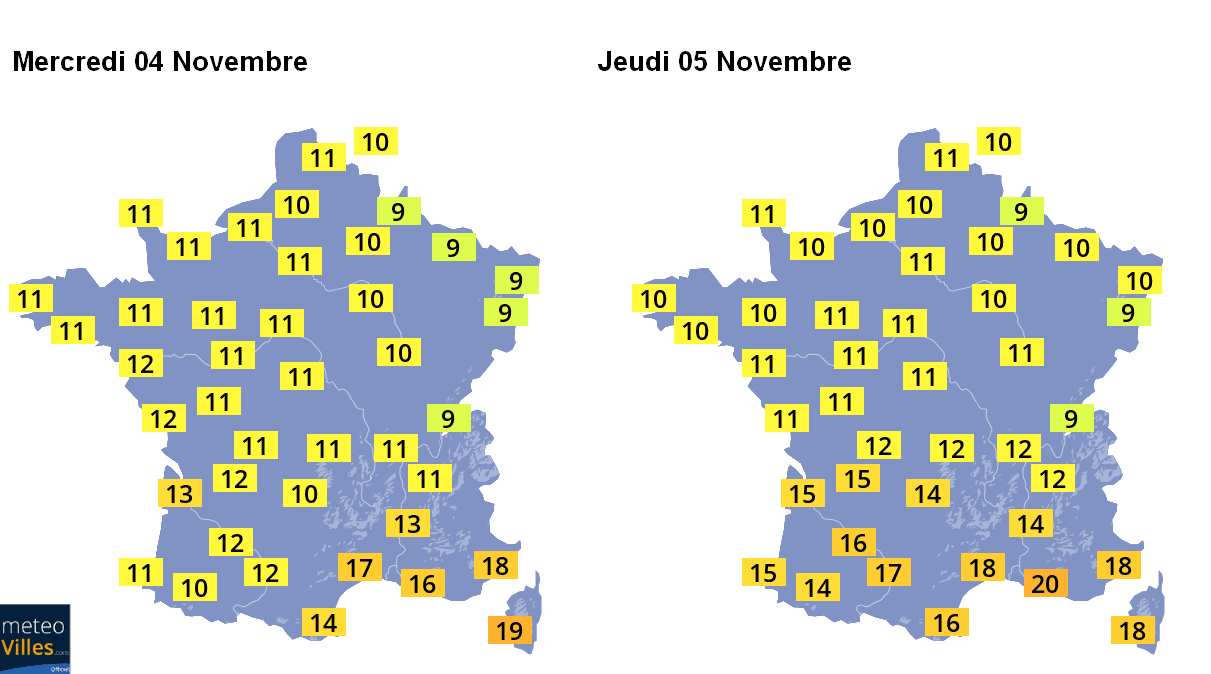 Températures maximales prévues en France entre le Mercredi 04 novembre et le Jeudi 05 Novembre - Météo-Villes