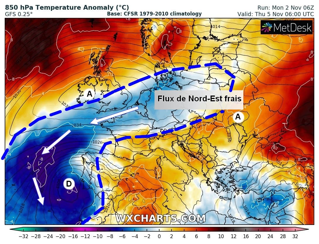 Anomalies de températures à 850hPa et isobares sur l'Ouest de l'Europe le Jeudi 5 Novembre - Modèle GFS via WX CHARTS
