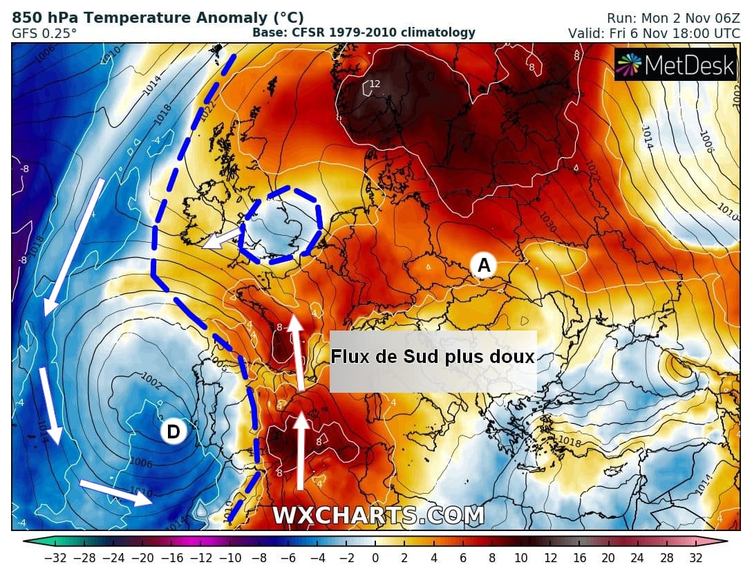 Si un temps temporairement doux et assez calme devrait régner en début de semaine sur la majeure partie du pays, les scénarios tendent de plus en plus vers la reprise d’un courant d’Ouest/Nord-Ouest perturbé à partir du 12 Novembre sur l’Ouest de l’Europe.