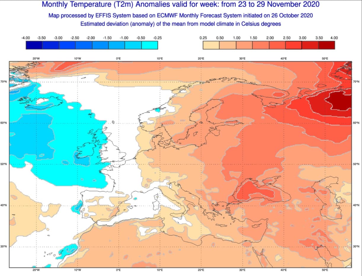 Anomalies de températures sur l'Ouest de l'Europe durant la semaine du 23 au 29 Novembre - Modèle ECMWF via EFFIS