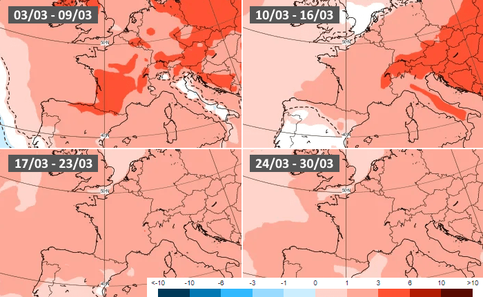 Anomalies thermiques hebdomadaires au mois de mars 2025 - modèle européen via ECMWF