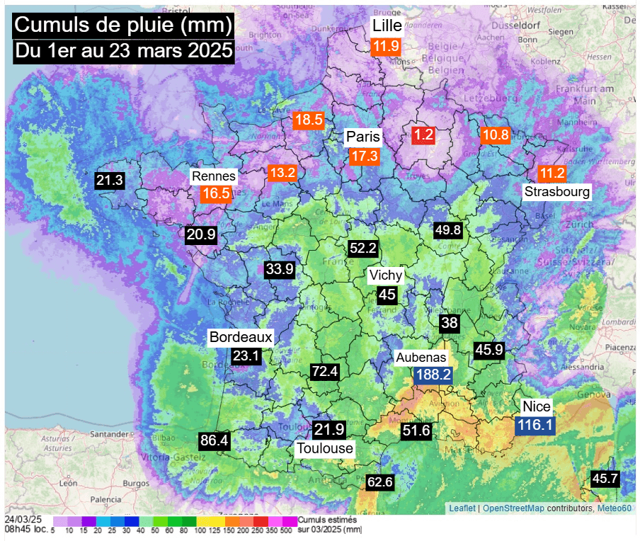 Cumuls de précipitations du 1er au 24 mars 2025 sur la France – Via meteo60.fr