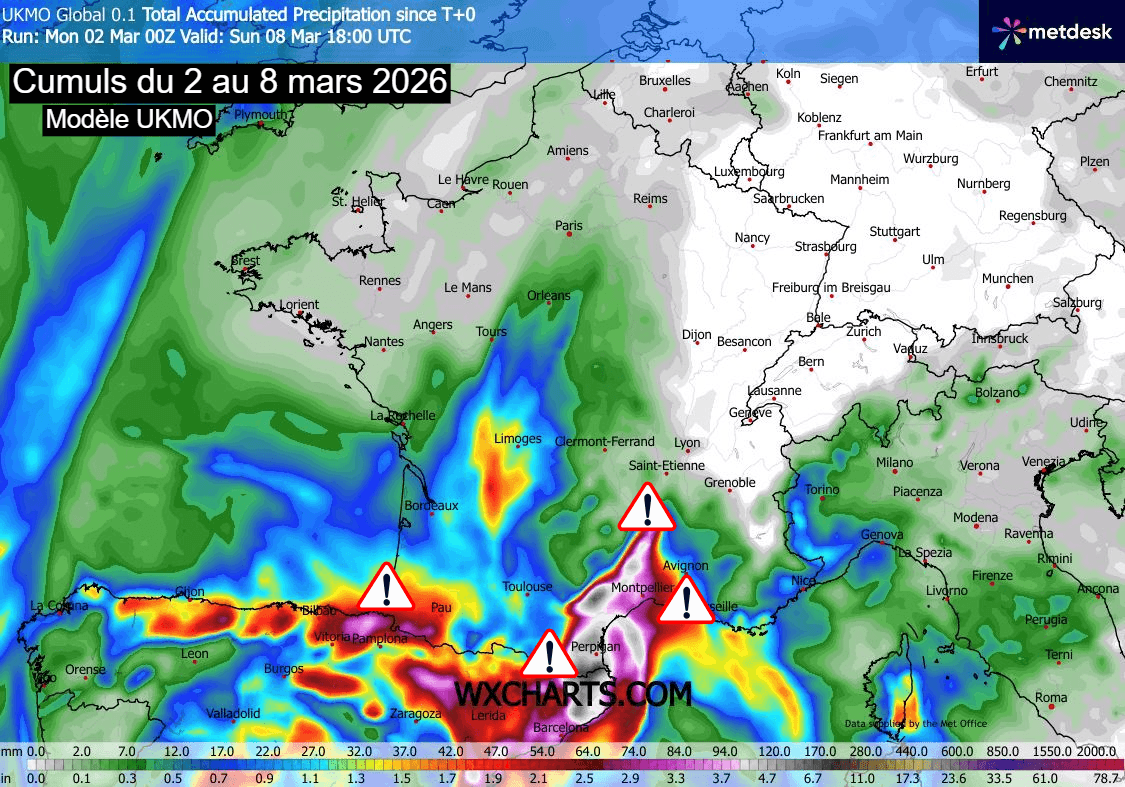 Cumuls de précipitations attendus d'ici le 8 mars 2026 sur la France – Modèle UKMO via WX CHARTS