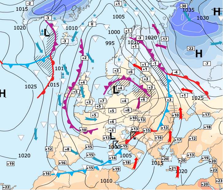 + La France et toute l’Europe occidentale reste influencées par une un vaste système dépressionnaire accompagné d’air froid.