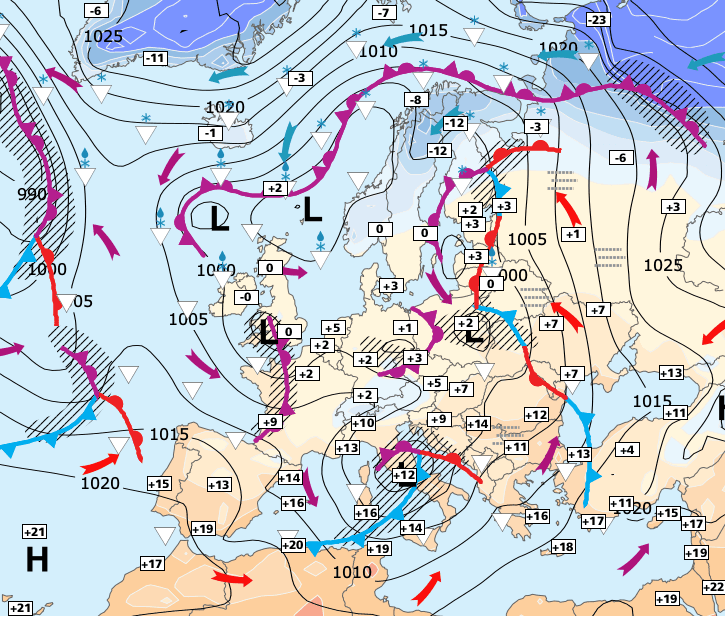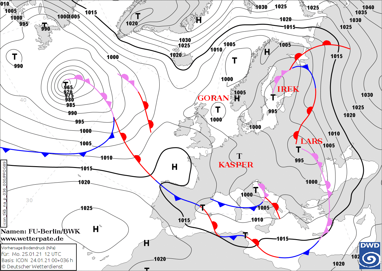Noms des dépressions et anticyclones prévus pour lundi 25 janvier 2021 à midi (Berlin)