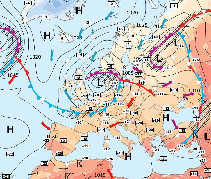 + La France devrait rester située au cœur d’un conflit entre l’air froid qui recouvre toute la partie nord de l’Europe et l’air chaud qui tente d’envahir la partie sud.
