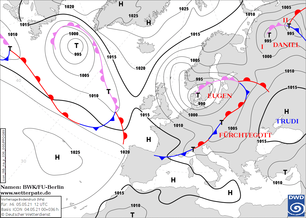 Noms des dépressions et anticyclones prévus pour mercredi 5 mai 2021 à midi (Berlin)