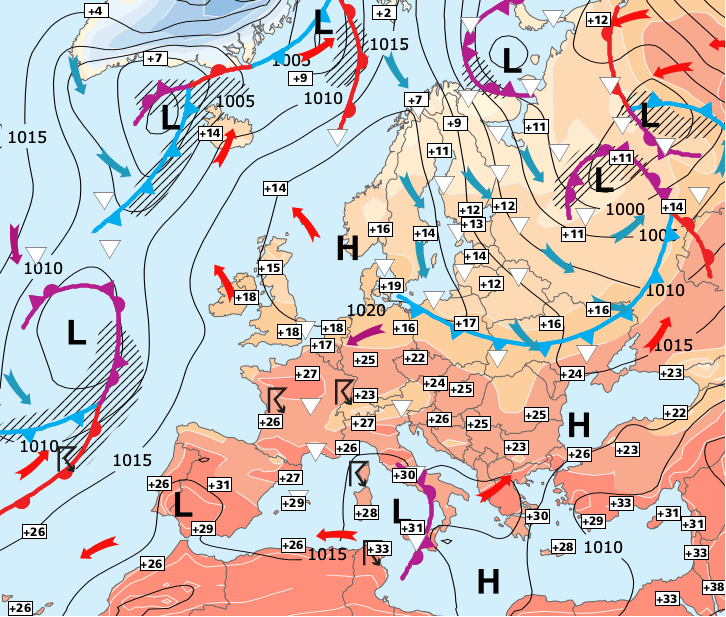 + L’instabilité qui concernait essentiellement la moitié Sud de la France est donc remontée vers le nord car l’anticyclone norvégien a moins d’effets.