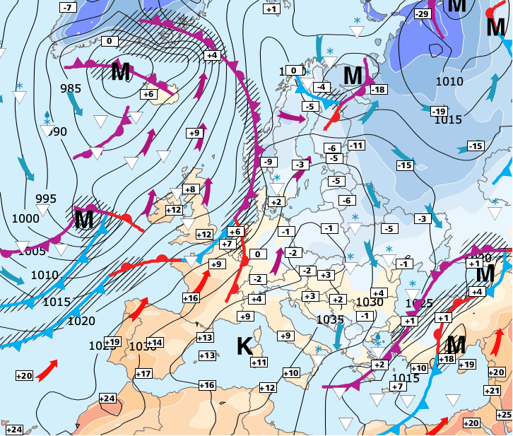 + En tout cas, le naturel revient au galop… Et le classique courant océanique qui caractérise l’Europe occidentale se remet rapidement en place, chassant l’air froid continental vers l'est.