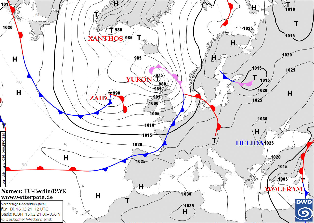 Noms des dépressions et anticyclones prévus pour mardi 16 février 2021 à midi (Berlin)