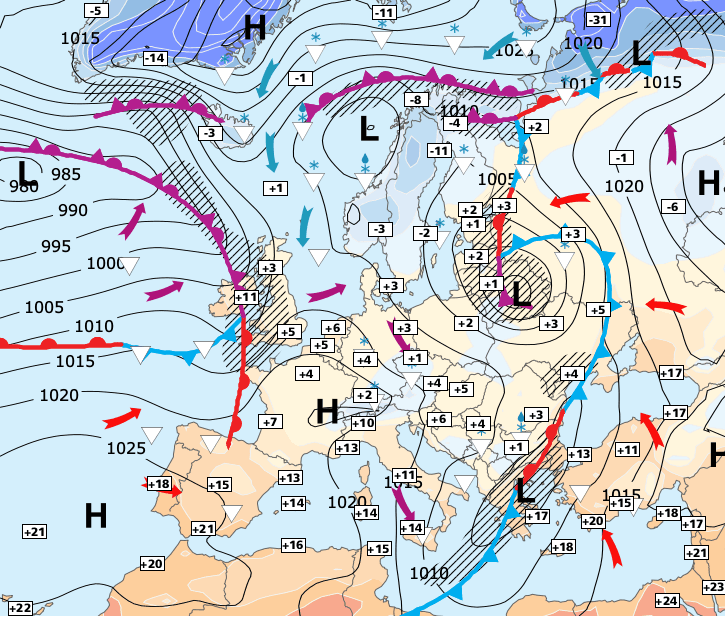Noms des dépressions et anticyclones prévus pour mercredi 27 janvier 2021 à midi (Berlin)