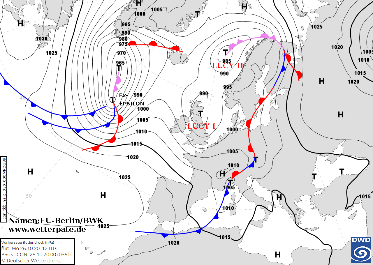 Noms des dépressions et anticyclones prévus pour lundi 26 octobre 2020 à midi (Berlin)