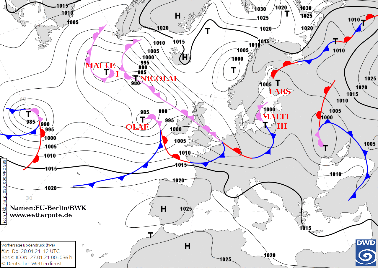Noms des dépressions et anticyclones prévus pour jeudi 28 janvier 2021 à midi (Berlin)