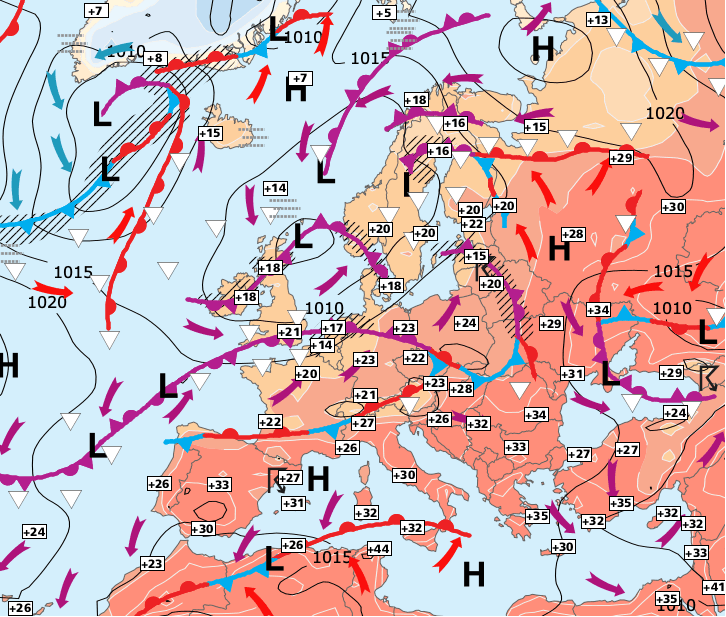 + L’anticyclone subtropical d'Europe du Sud remonte peu à peu vers le nord et la zone dépressionnaire d’Europe du Nord ne sous influencera quasiment plus à partir de mercredi.