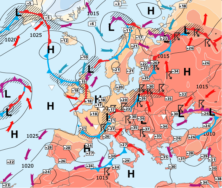 Noms des dépressions et anticyclones prévus pour vendredi 25 juin 2021 à midi (Berlin)