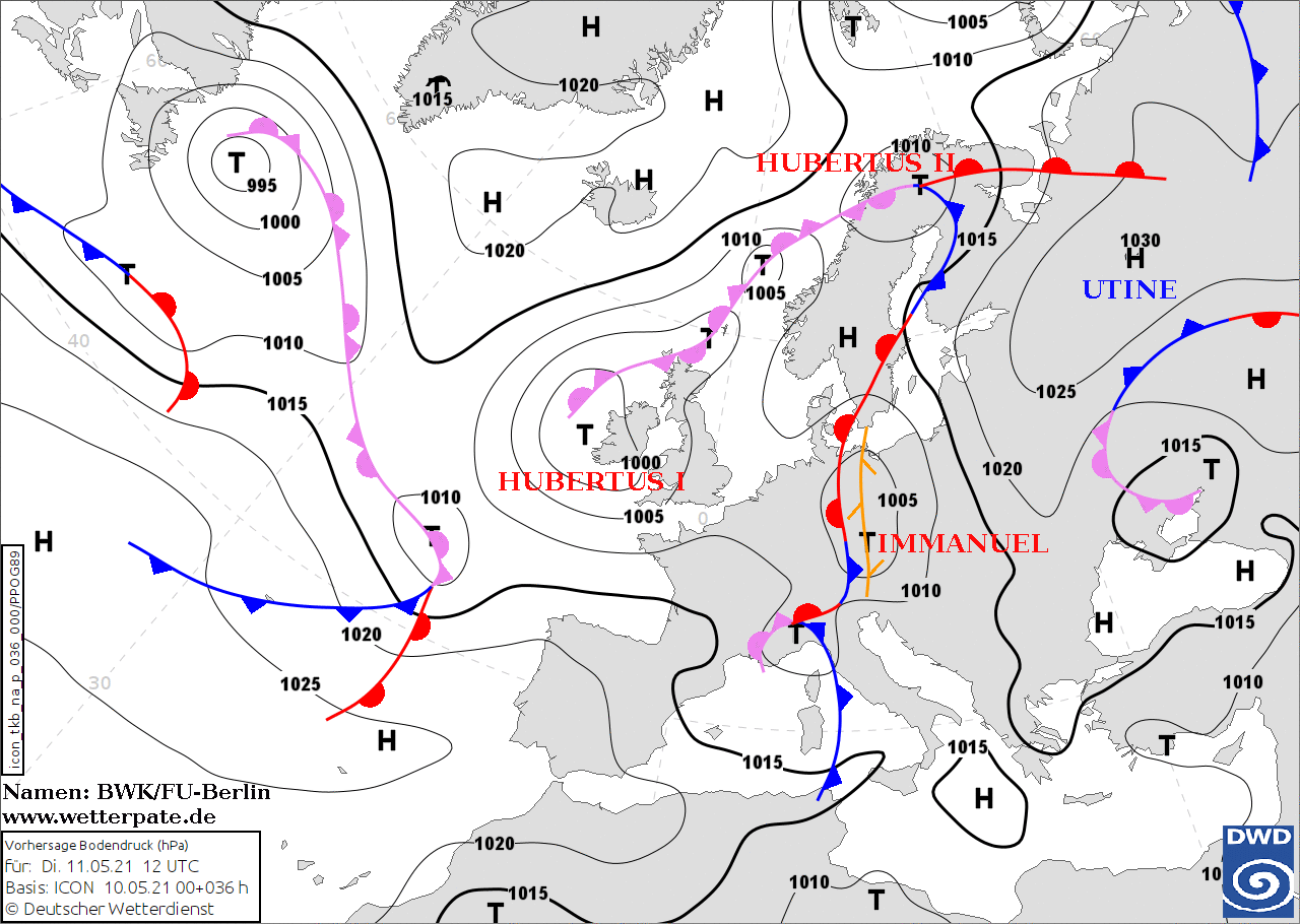 Noms des dépressions et anticyclones prévus pour mardi 11 mai 2021 à midi (Berlin)