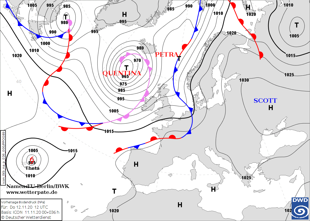 Noms des dépressions et anticyclones prévus pour jeudi 12 novembre 2020 à midi (Berlin)