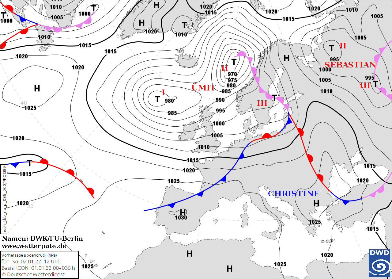 Noms des dépressions et anticyclones prévus pour samedi 2 janvier 2021 à midi (Berlin)