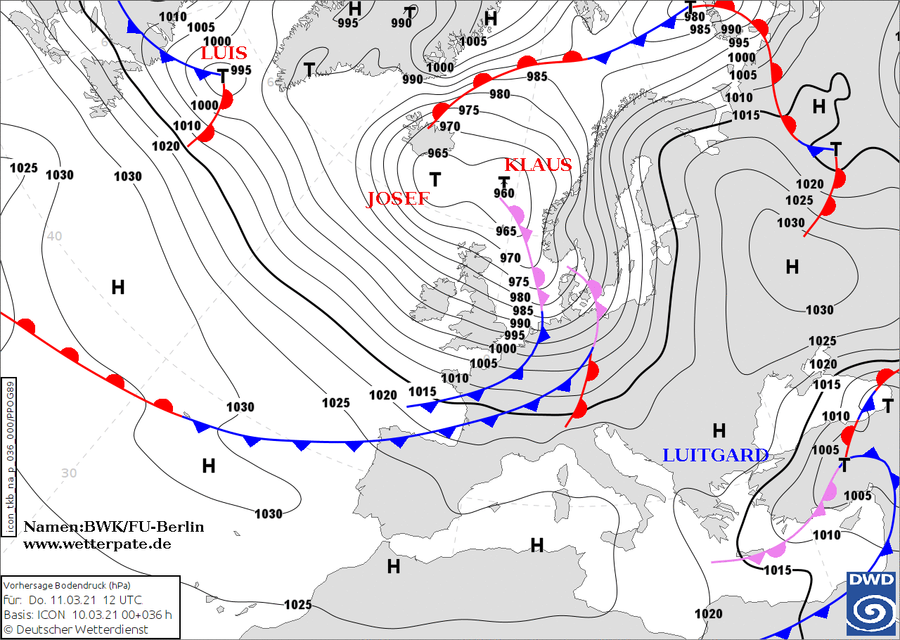 Noms des dépressions et anticyclones prévus pour jeudi 11 mars 2021 à midi (Berlin)