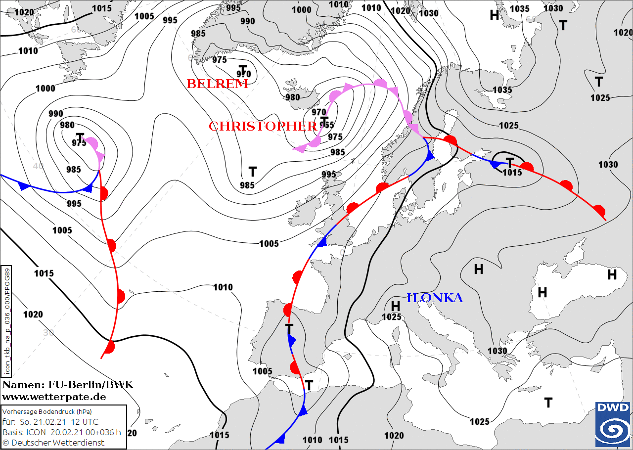 Noms des dépressions et anticyclones prévus pour dimanche 21 février 2021 à midi (Berlin)