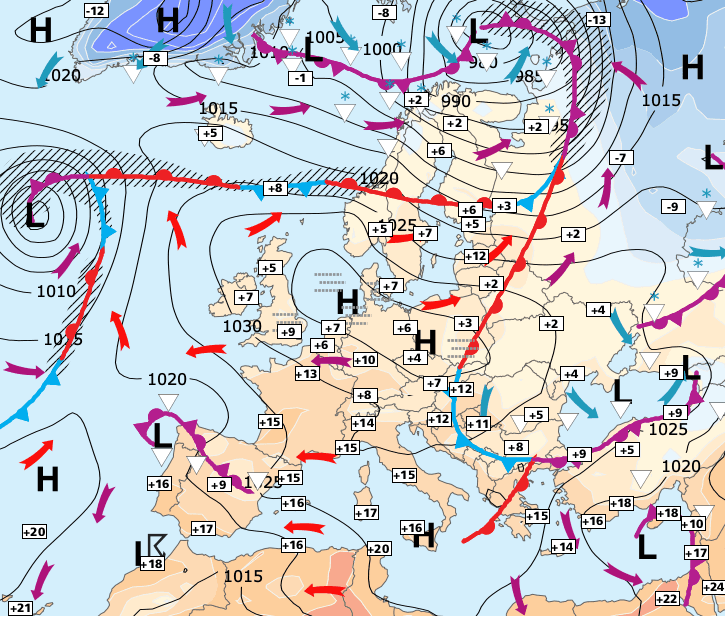 + L’anticyclone qui jusqu’alors était centré sur le sud de l’Angleterre se décale maintenant vers l’Allemagne, et l’air plus doux en provenance d’Afrique du Nord va pouvoir commencer à remonter vers nos régions.