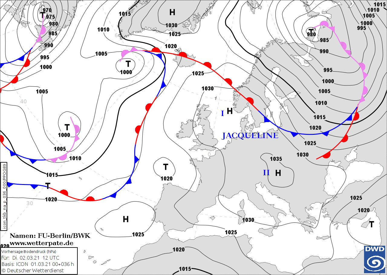 Noms des dépressions et anticyclones prévus pour mardi 2 mars 2021 à midi (Berlin)