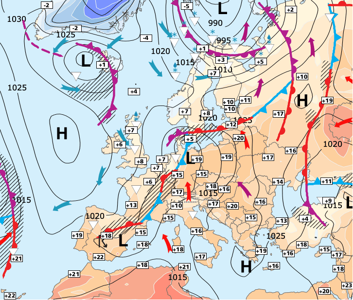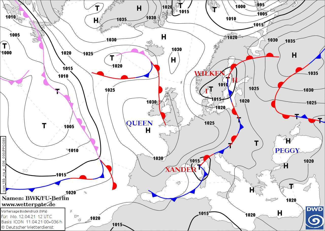 Noms des dépressions et anticyclones prévus pour lundi 12 avril 2021 à midi (Berlin)