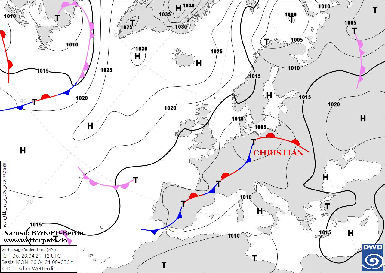 Noms des dépressions et anticyclones prévus pour jeudi 29 avril 2021 à midi (Berlin)