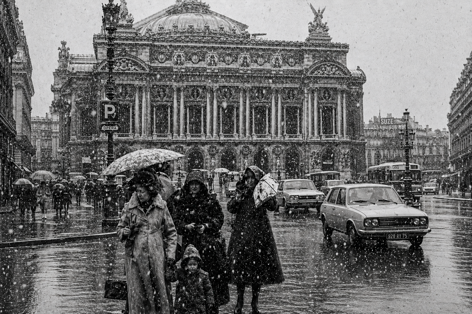 Les giboulées de neige du 2 mai 1979 sur la place de l'opéra à Paris - meteo-paris.com