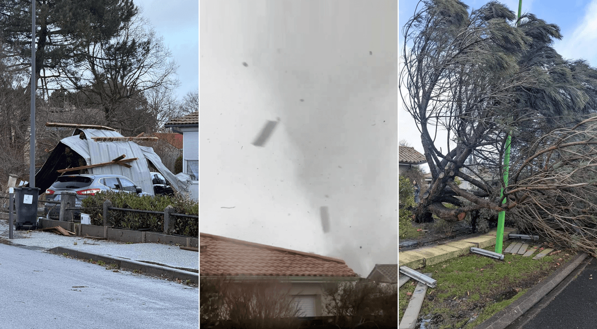 Photos de la petite tornade qui a occasionné des dégâts à Mios en Gironde le 31 janvier 2025 - composition Météo express